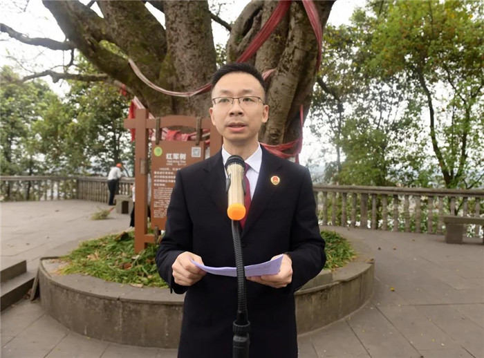该院党组成员、副检察长何小康受该院党组书记、检察长彭彪彬委托,作了《在红军树前的讲话》。何小康满怀深情地回顾了红军树的光辉历史:1933年,红军第四方面军第九军某部面对生死存亡的严峻考验,长征经过蓬安,付出巨大牺牲,也传递了革命的火种,蓬安7000余名热血青年投身革命,为老百姓带来了中国人民站起来的希望。当时,红军攻占了龙角山,并在这个制高点短暂驻军。部队需要的粮食和日用品,都需要后勤部门的战士下山采购。一个红军战士挑回一担军粮,在龙角山顶卸粮时,将一截当成扁担的黄桷树枝插在地上。时间一久,这截黄桷树枝竟长出了嫩芽。红军离开蓬安后,蓬安人民心怀对红军的无限敬仰,把这棵小树保护起来,长成了如今的参天大树。