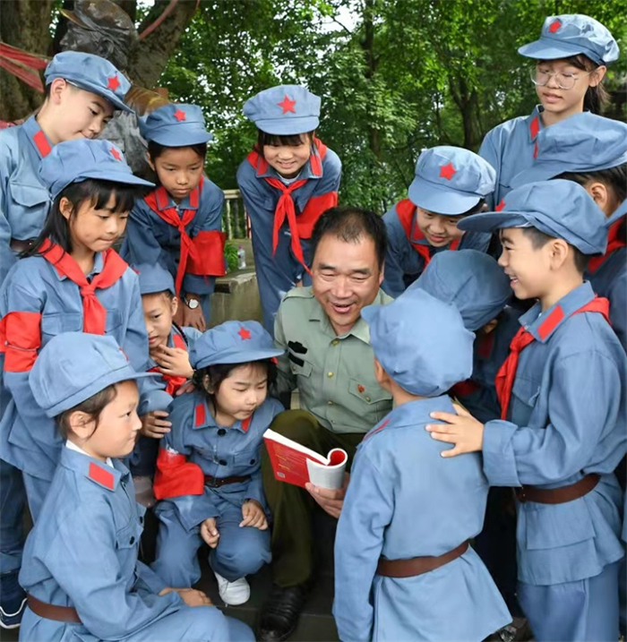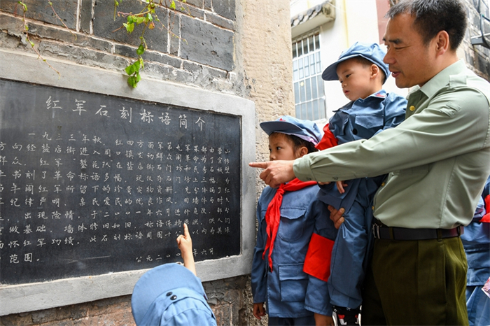 在红军街重走红军路,老兵陈亚雄一边用手指在石板的凹痕间慢慢挪动,一边将过往娓娓道来。身着红军服的同学们深受感染,他们纷纷伸出稚嫩的小手,轻轻触摸石刻上或深或浅的凹痕,识别刻在石柱上的革命文字,追忆革命峥嵘岁月。