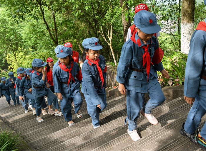 沿着石板路穿过红军街,从龙角山山腰往上,层层叠叠的石梯一眼望不到尽头。在空寂的山路上,伴着山林间叽叽喳喳的鸟雀叫声,这群10岁左右的“小红军”,迈着坚定的步伐,拾级而上,挺进“红军树”。