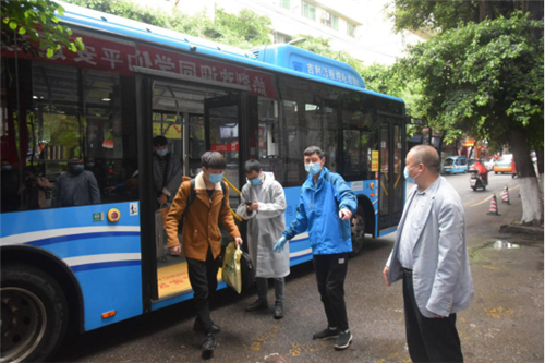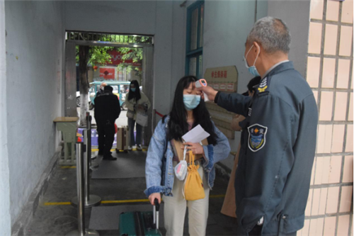 为确保学生返校安全,避免在返校途中感染新冠病毒,南职院在火车站及嘉陵车站安排专车接送到站学生。抵达校门口,学生们依次保持一定间距排队,配合门卫保安进行行李消杀,体温检测,有序进入校园。