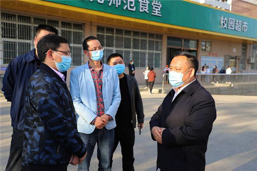 | 代俊(前左二)局长在南师校校园指导开学疫情防控工作 |