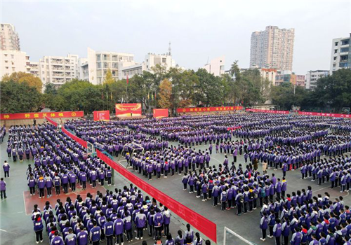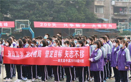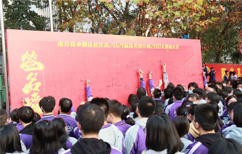 “我们以青春的名义宣誓,我一定牢记使命,放飞梦想;主动复习,保质保量;强健体魄,百炼成钢;锤炼意志,激情昂扬……”11月16日上午,南充高中顺庆校区和临江校区,各式各样的励志标语在校园内飘扬,阵阵铿锵有力的呐喊划破了校园的宁静,该校2021年高考倒计时200天誓师大会隆重举行,2000余名毕业班师生在运动场激情宣誓,为备战2021年高考表决心,鼓干劲。