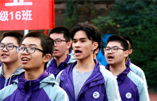 “六月息,扶摇上,鹏起天地万里浪。东风吹,战鼓擂,咱们一班怕过谁……”伴随着激动人心的音乐,毕业班学生代表紧握右拳,依次上台领誓,用洪亮的声音喊出为梦想加油鼓劲的口号。台下师生激情满怀,以班级为单位依次齐声呐喊宣誓,雄浑的声音萦绕校园,气势磅礴,直抵人心。最后,全体高三学生纷纷在签名墙上庄重签名。
