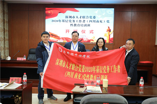 随后,深圳市人才联合党委2020年基层党务工作者党性教育培训班开班仪式在庄严的国歌声中举行。中共仪陇县委组织部副部长、张思德干部学院执行院长、县委党校常务副校长何绪德致欢迎辞并为培训班授班旗。