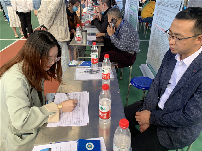 双选会现场,许多单位前都挤满了应聘的学生,积极与招聘人员交流,主动了解用人单位的情况。同学们在了解用人单位基本情况的同时,结合自身专业和实际情况,合理选择单位后积极投递简历,并认真回答用人单位的问题。前来参与应聘的学生们纷纷表示,学校此举有效地缩短了毕业生与用人单位之间的距离,为用人单位和毕业生求职的双向选择提供了良好的交流平台。