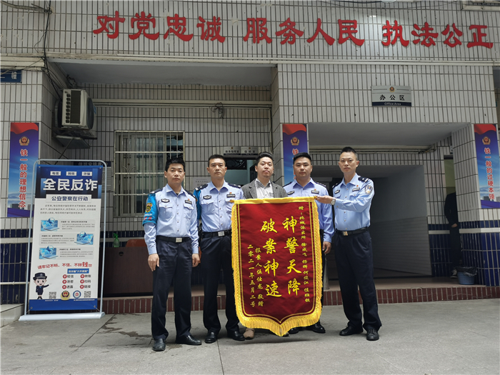 四川新闻网消息(杨烈 文/图)5月7日上午,市民伍先生来到南充市公安局顺庆区分局北城派出所,专程将一面写有“神警天降、破案神速”的锦旗送到民警手中,感谢民警迅速追回自己在理发店内被盗的手机,为民警高效负责的工作态度点赞。