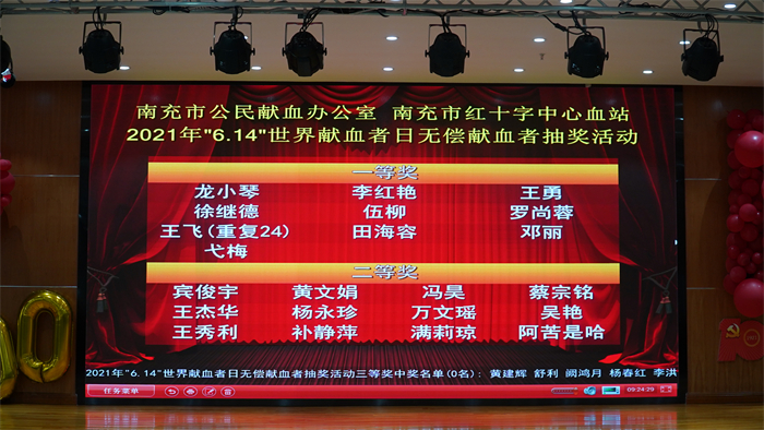 “抽奖开始!”随着南充市中心血站副站长韩慧瑛一声令下,大屏幕上的名字迅速滚动起来。最终,产生一等奖10名,二等奖20名,三等奖30名。