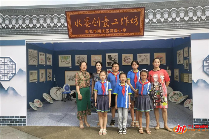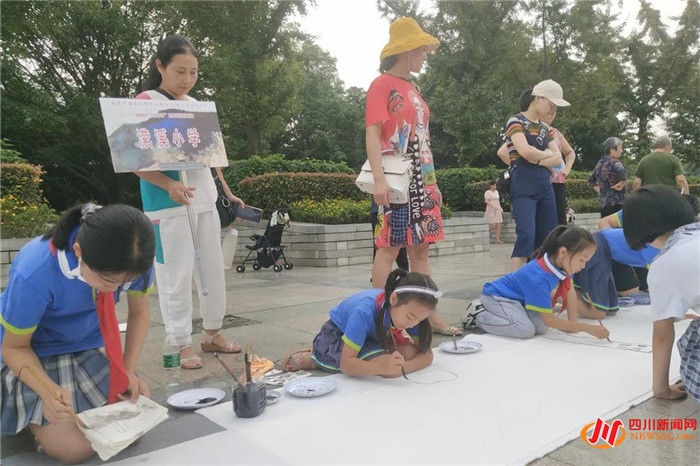该校美术教师吴春梅、陈丽君、肖盛琼、许德君四位老师不惧酷暑,亲手搭建工作坊展示区,现场指导学生绘画出以家乡美为主题的五米水墨卷,并题词“嘉陵江风光”。