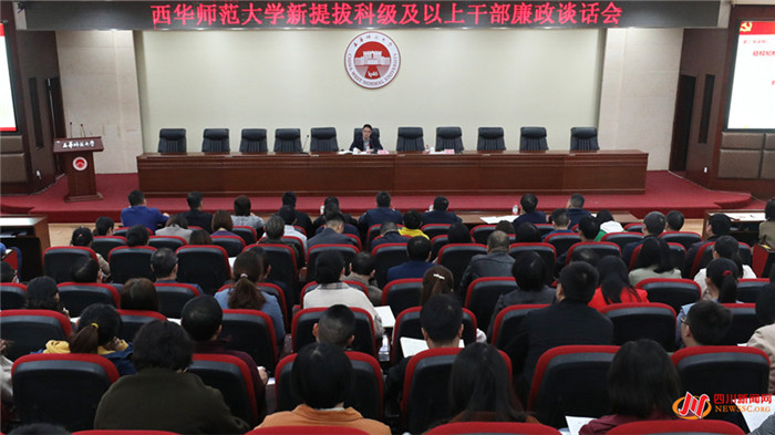 四川新闻网消息 近日,西华师范大学新任处科级干部集体廉政谈话会在该校图书馆学术厅召开,驻校纪检监察组组长、校党委副书记、纪委书记张明出席会议并进行廉政谈话。本次会议由驻校纪检监察组副组长、校纪委副书记周芳主持,学校2020年以来新任处科级干部参加会议。
