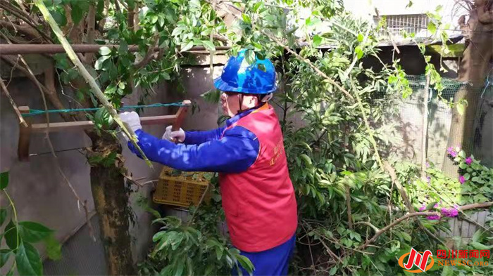 经了解,院墙内存在安全隐患的住户名叫唐能英,当天只有她12岁的孩子独自在家。党员服务队到达唐能英家后,迅速对现场进行勘察,发现其房屋院墙内的白杨树、三角梅由于长期未修枝,树枝即将长到进户线,存在严重的安全隐患,由于树枝及电线属于客户所有,服务队队员陈海均迅速与唐能英取得了联系,向其说明安全隐患所在,并提出了整改建议。在获得住户同意后,服务队随即对树枝进行修剪,排除隐患。