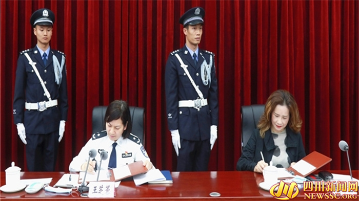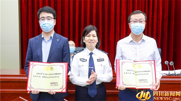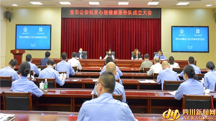 签约仪式上,大家共同见证了南充市公安局心理健康服务队的正式成立,王芝蓉和刘月光代表双方签署了《心理健康服务合作协议书》,市身心医院两名专家受聘担任服务队副队长。