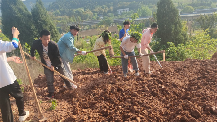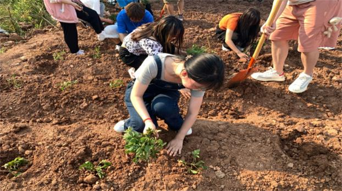 刨开硬土、耙去石头、翻土除草、挖坑选苗、播种浇水……同学们听从指导有条不紊地进行分工合作,短短时间,实践基地已然焕发出新的生机。