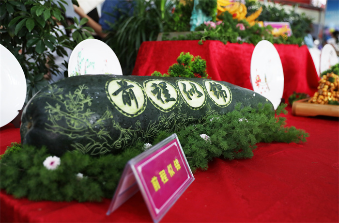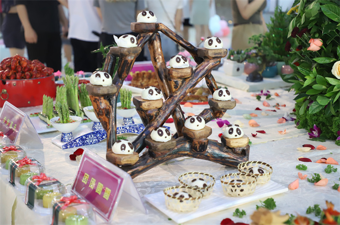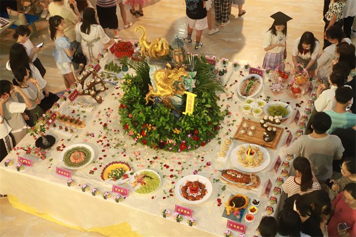 21日11点半,在毕业典礼现场留念结束后的毕业生们陆续来到了华凤校区西河片区华凤园餐厅、西山片区李园餐厅,只见一派热闹喜庆景象。餐厅内彩色气球点缀其间,横幅标语相互映衬,桌上陈列着写有多样祝福语的卡牌,美味的饭菜、水果、糕点琳琅满目,大厅内的展示台上摆放着龙型雕刻与花草摆台相结合的“龙腾盛世之美味西华”,大虾和秋葵摆盘成太阳形状的“前程似锦”,虾仁、西米、豆粉结合摆成荔枝造型的“金秋时节”等等工艺美食,精湛厨艺、颇具巧思。大家赞叹声不绝,纷纷拍照留念。