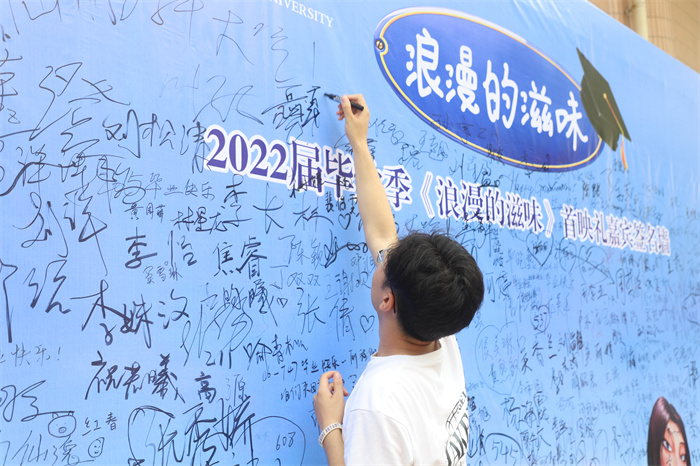 毕业生们有的在签名墙写下对母校的寄语与各式祝福,有的边排队边叙离别情谊,有的忙着拍照留念。华凤园餐厅内,管理学院学生杨帅斌和同伴们兴奋地清点着各自是“春夏秋冬”中的哪个套餐,每人拿到了一份两荤两素套餐、一份水果、一份写着校训或多种祝福语字样的糕点、一碗绿豆汤。李园餐厅内,电子信息工程学院董帅兴奋地在“相亲相爱一家人”家庭圈里晒图:红烧排骨、香辣鸡腿、麻辣舌片……学校请我们吃自助,不要太羡慕。