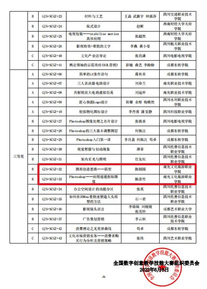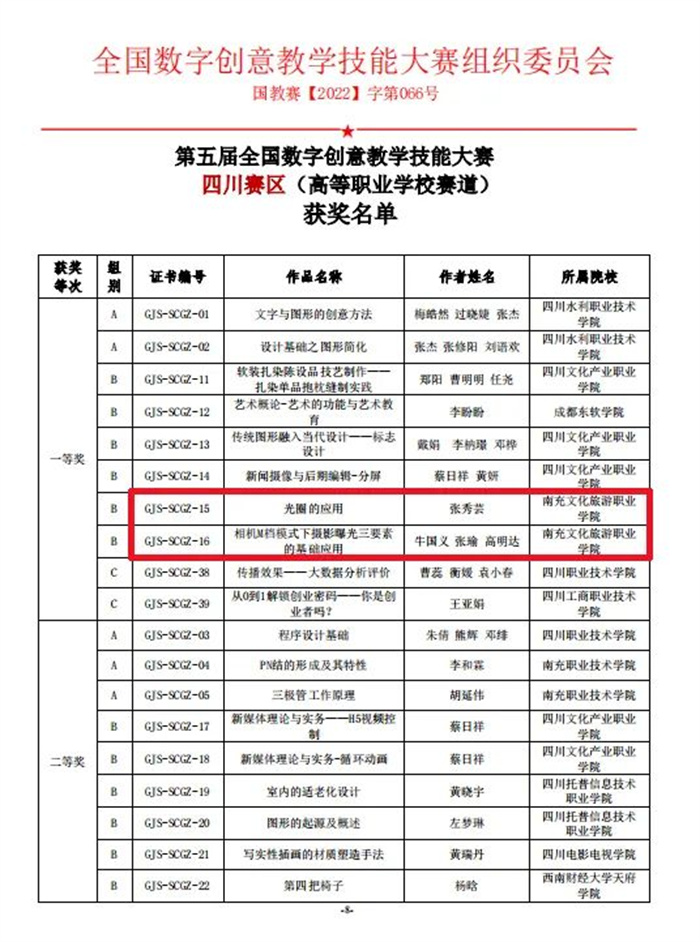 四川新闻网消息 近日,由全国高等院校计算机基础教育研究会、全国数字创意教学技能大赛组织委员会主办,全国高等院校计算机基础教育研究会数字创意专业委员会承办的全国数字创意教学技能大赛落下帷幕。南充文化旅游职业学院教师报送的作品喜获佳绩,国赛中揽获1个一等奖、3个二等奖、4个三等奖,省赛中揽获2个一等奖、2个三等奖。
