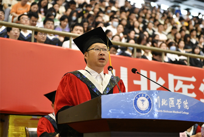 杜勇代表学校向顺利完成学业、即将踏上人生新征程的全体毕业生致以最深切的祝福和最热烈的祝贺。他用“岁月不居,见证奋进与发展”“韶华流转,镌刻拼搏与成长”两个主题概括了青春洋溢的学子们与奋进的川北医同风雨、共担当的奋斗成长历程。