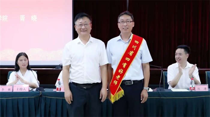四川新闻网消息 9月9日上午,西华师范大学在华凤校区图书馆306会议室召开庆祝第38个教师节表彰暨座谈会,会上校党委书记王元君为首届四川省“四有”好老师胥晓佩戴绶带。