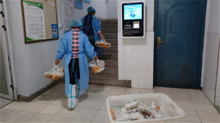 出于疫情防控工作和维护学生健康需要,部分学生返校后进入隔离宿舍开始隔离生活,及时吃上饭菜成为学生本人和学工老师关心的首要问题。老师们主动申请成为志愿者,为每一位隔离学生送上热乎乎的饭菜。