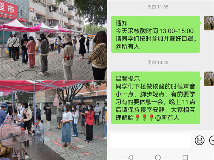 新生报到当天,大数据发现新生中有两名密接者,经排查,全校47间寝室被“静态管理”,致远楼成了“重灾区”,33间寝室封控,管理员郑倩玉也被隔离。在危急时刻,管理员立即开展线上办公、线上服务,值班员林世荣和保洁员陈远秀驻守公寓,坚守岗位。封控期间,她们配合默契,引导学生有序采集核酸、用心用情服务学生诉求,积极帮助解决学生的实际困难:通过线上线下安抚新同学情绪、对接超市帮同学购买生活必需品、为有胃病的同学单独订餐……一桩桩、一件件看似平凡的小事,却搭建起了同学们和宿管阿姨间的信任桥梁,流淌着彼此的爱,温暖了同学们的心、获得了声声感谢。宿管阿姨们用坚守和爱心守护同学们的安全健康,诠释润物无声的服务育人。