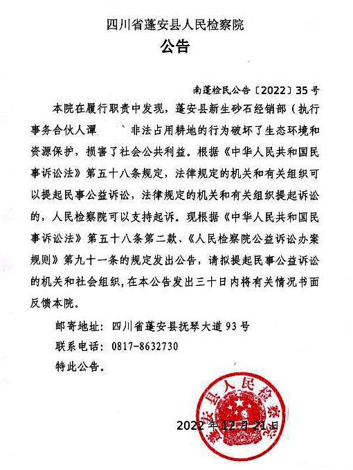 四川新闻网消息(林璐怡 记者 郭建坤) 近日,记者从蓬安县人民检察院发布的公告获悉,蓬安县新生砂石经销部(执行事务合伙人谭某)因非法占用耕地的行为破坏了生态环境和资源保护,损害了社会公共利益,将面临有关机关和社会组织的起诉。