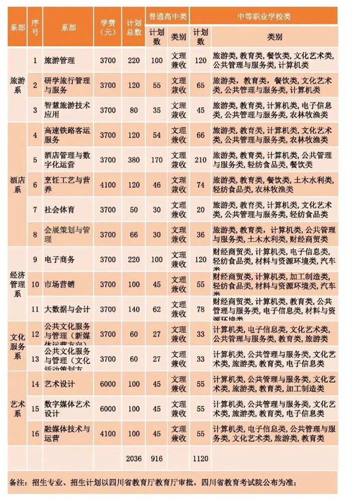 四川新闻网消息 2月2日,南充文化旅游职业学院发布2023年单招计划,计划表显示:2023年高职单招招生计划2036名,其中招收普通高中类考生916名,招收中职类考生1120名。