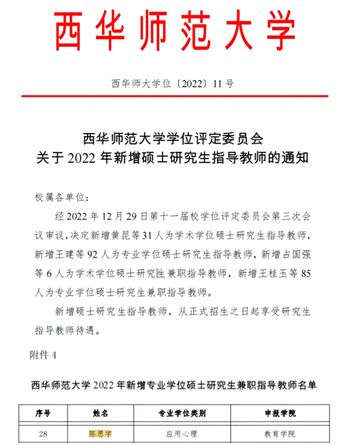 四川新闻网消息 近日,西华师范大学公布了2022年新增硕士研究生指导教师名单,南充市身心医院副院长陈思宇受聘为西华师范大学应用心理专业硕士研究生兼职导师,成为医院建院以来首位“硕导”。