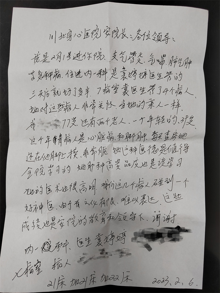 送上感谢信的这名患者刘某,今年已经77岁高龄,患有支气管炎、气喘、肺气肿等多种疾病。2月1日,刘某住进南充市身心医院内科病房,由袁婷婷医生负责主治。“三天(病)就好了多半”,刘某在信中写到,对医生的仁心医术高度肯定,“我们这几个病人碰到了好医生”。