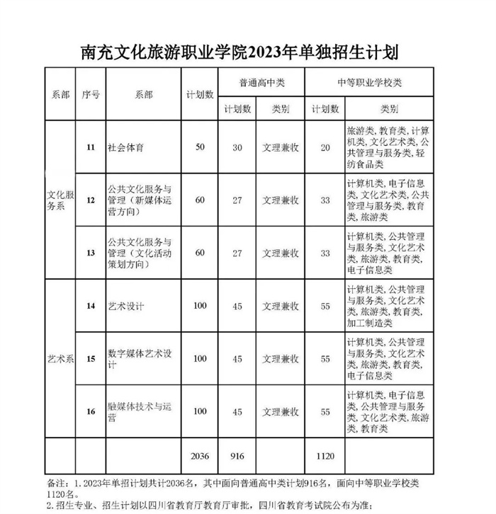 四川新闻网消息 2月27日,南充文化旅游职业学院发布2023年单招指南。该校2023年高职单招招生计划2036名,其中招收普通高中类考生916名,招收中职类考生1120名。在川招生代码:5799。