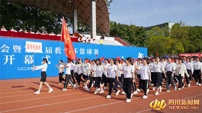 四川新闻网消息(刘俊榕 李婷婷 文/图)4月14日上午,川北医学院高坪校区风雨操场上彩旗飘扬,人头攒动,该校第十七届运动会暨第八届“教学杯”篮球赛开幕式成功举行。学校党委副书记、校长杜勇,党委副书记黄平,党委常委、副校长张小明,党委常委、副校长张波出席开幕式。本次运动会开幕式由该校党委常委、副校长、体委主任何永斌主持。