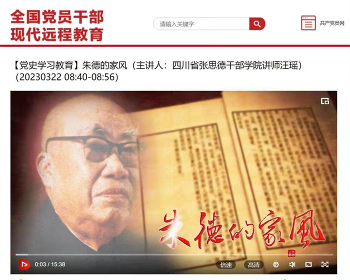 据了解,《朱德的家风》课程以家风为载体,通过回顾朱德“立德树人,勤俭持家”故事,展示了朱德同志为民族独立和人民解放、国家富强和人民幸福建立的不朽功勋,为党和人民的事业不懈奋斗一生。