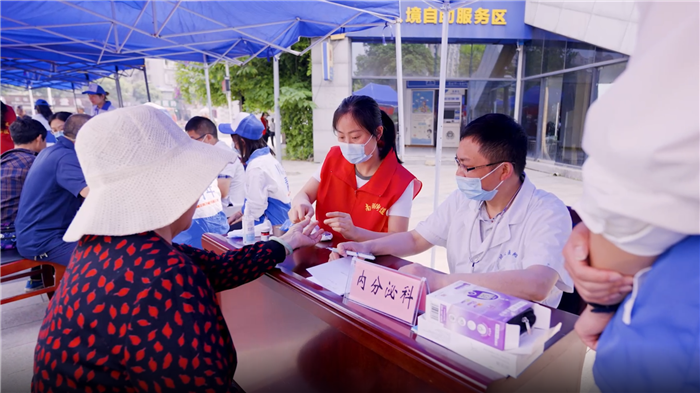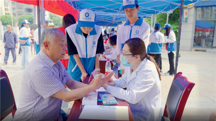 仪式结束后,川北医学院志愿者们协助开展慢病多学科联合现场义诊活动,前往附近社区进行宣讲,为老年人普及慢病管理知识,引导他们参与义诊活动,并有序维持现场秩序。
