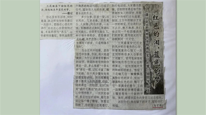 在马宁帅的作品中有一篇《红色的泪蓝色的梦》极其特殊,那是他以校园里的蓝花楹为主题抒写毕业情怀,在川北医学院的毕业生中反响极为强烈。他回忆道:“那是一个很平常的午后,我看见有一群毕业生的离开,蓝花楹下大家相互道别,满地的紫蓝色花瓣映衬着,我思绪万千便写下了这篇文章。逐渐地,蓝花楹也成了学校毕业季的一种标志,大家都会在一年一度的毕业季相约于蓝花楹丛中,留下自己青春的剪影。”