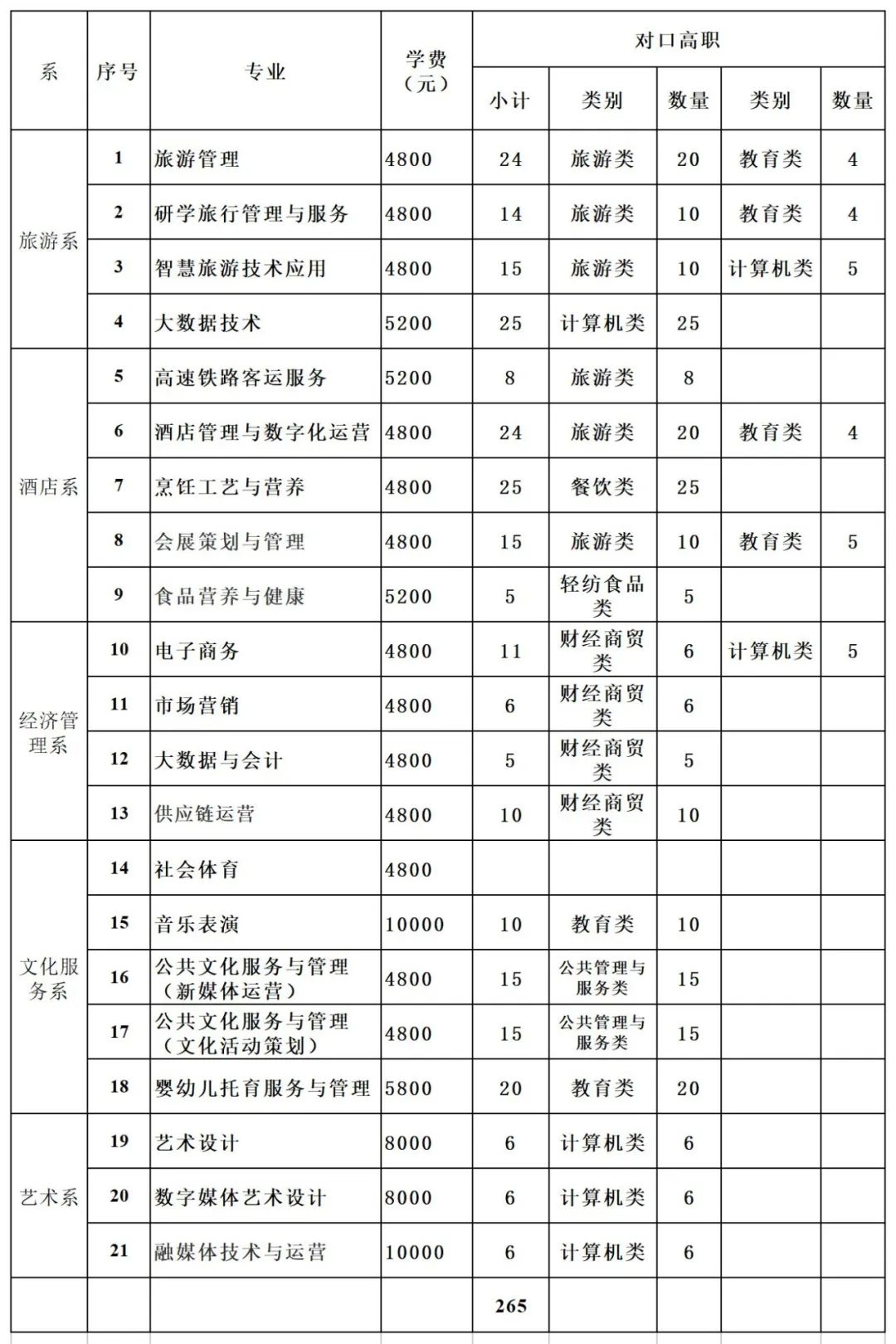 人才培养特色鲜明。现有全日制在校学生8600余人。聚焦服务四川文旅强省、南充区域文旅中心建设,设立旅游系、文化服务系、酒店系等7个教学系(部、院),开设旅游管理、酒店管理与数字化运营、高速铁路客运服务、会展策划与管理、音乐表演、烹饪工艺与营养、社会体育、市场营销、电子商务、艺术设计、婴幼儿托育服务与管理等20个专业,涵盖文化旅游领域的吃、住、行、游、购、娱“六要素”。实施“比学习、比技能、比就业”文旅英才工程,深入开展校企合作、产教融合,推进“1+X”证书试点,培养高素质复合型文旅精英,400余名文旅学子在国省市各项大赛中摘金夺银,3000余名学生考取各类技能等级证书。