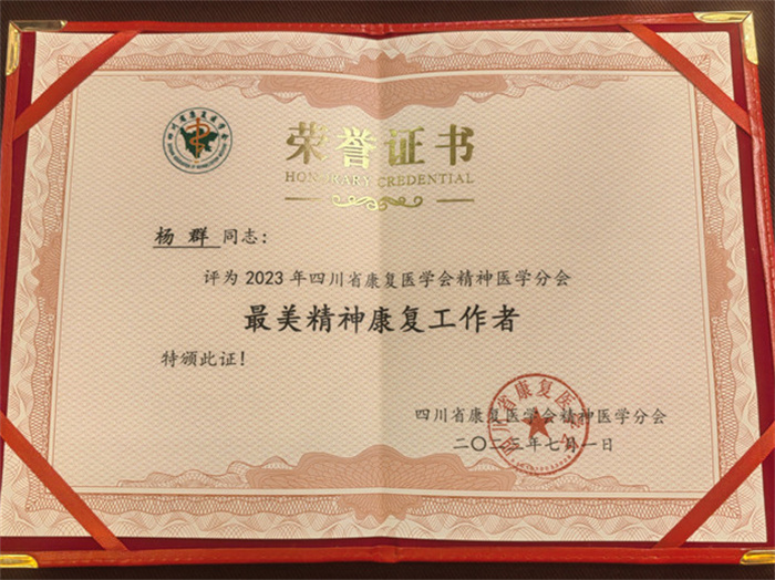 四川新闻网消息 6月30日,在成都召开的四川省康复医学会第十二届精神康复学术年会上,南充市身心医院护理部副主任杨群获评“最美精神康复工作者”称号。此次活动由四川省康复医学会精神医学分会主办,全省共评选出10名“最美精神康复工作者”,杨群脱颖而出。