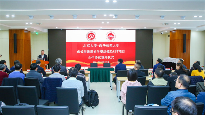 四川新闻网消息 2月29日下午,《西华师范大学-北京大学成长型通用光学望远镜EAST项目合作协议》在北大科维理天文与天体物理研究所举行,西华师大党委副书记、校长陈涛,北京大学副校长、中国科学院院士张锦分别致辞。两校EAST项目合作协议的签订,是西华师大与北京大学深化校校合作的又一重大成果,将推动两校在天文学和物理学人才培养、科学研究等方面开展深度合作。