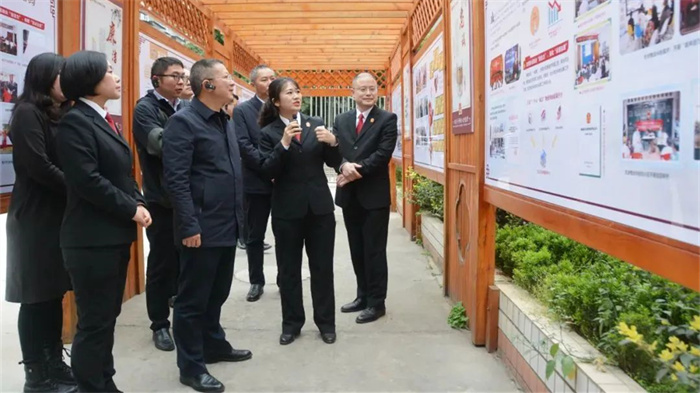 在法庭院内的法治文化长廊,吴涛一行通过听汇报、看展板、提问题等方式,详细了解火花法庭在党建、物业纠纷多元治理、家事纠纷化解等方面的亮点成效。