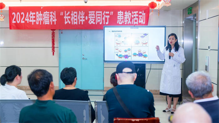 当天,医院在肿瘤科住院部还举办了一场别开生面的患教会,副主任皈燕和主任护师胡建萍分别以“恶性肿瘤靶向、免疫治疗常见副反应的处理”“肿瘤患者与家属的心理调节”为主题,为住院患者和家属详细讲解了靶向和免疫药物的治疗原理、常见副反应及处理原则,并分享了一系列实用的自我识别和处理方法,指导住院患者和家属进行科学的心理调节,学会与医护人员沟通,了解自身病情和治疗方案,在抗击肿瘤过程中保持积极态度和良好心态。