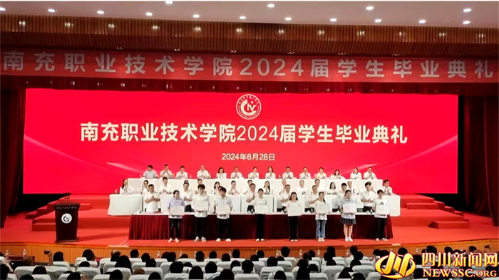 毕业典礼上,南充职业技术学院党委委员、副院长高炳易宣读了学院关于表扬2024届四川省优秀大学毕业生的通报;党委委员、副院长唐峻峰宣读了学院关于颁发成铭涵等学生毕业证书的决定。主席台前排就座的校领导为他们颁发证书。