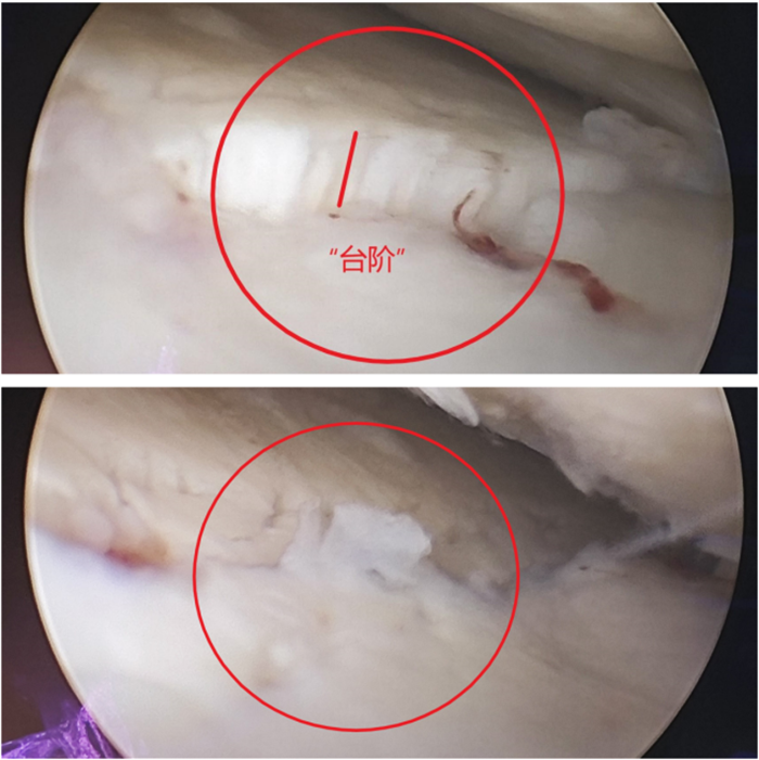 | 复位前可见明显“台阶”,镜下精准复位保证关节面平整。 |
