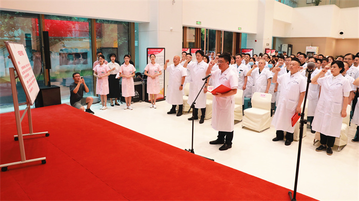 7月9日上午,川北医学院附属医院党委书记杨汉丰宣布文化路院区焕新归来,门诊正式投入试运行,并带领现场医务人员代表重温医学誓言。同时,门诊区域还开展了义诊体检、健康宣教、医保政策宣讲以及急救技能演示等惠民活动。