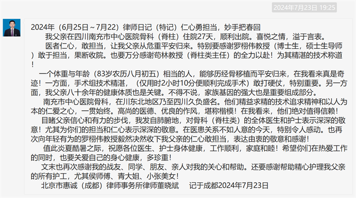 因此,两位专家就董大爷的相关病情、手术方案及可能出现的并发症等,与患者家属进行了非常细致的沟通。患方经慎重考虑后,同意施行手术治疗。最终,手术由苟林主任医师亲自主刀、罗栩伟副主任医师为助手,在麻醉科团队的鼎力支持下,成功地为董先生施行经前路结核病灶清除、椎管减压、人工椎体植入、钉棒系统内固定术。术后董大爷恢复良好,疼痛及活动受限症状明显改善,已佩戴胸腰支具下床行走,现已康复出院。