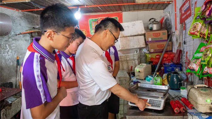 “同学们知道‘鬼秤’吗?一些不良商家通过非法手段改装电子秤,我们在购物时要注意秤的显示和操作,维护自己的合法权益。”市监局监管人员拿出手机,往商家秤盘上一放,“244克”,秤盘显示的重量和手机测定的重量一致,“手机变砝码,随时可检测,就是想作弊也很难。”