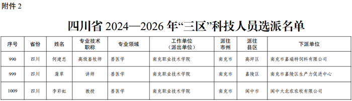 据悉,此次省级“三区”人才支持计划科技人员专项计划面向全省征集需求,南职院根据《四川省科学技术厅关于做好新一轮“三区”科技人才选派工作的通知》(川科农〔2024〕3号)《南充市科学技术局关于做好新一轮“三区”科技人才选派工作的通知》(南市科发〔2024〕13号)等相关文件精神,积极组织推荐满足需求的科技人员参与,经过基层单位审核推荐、派驻企业确认、市科技局审核,最终获省级认定、科技部农村中心备案。