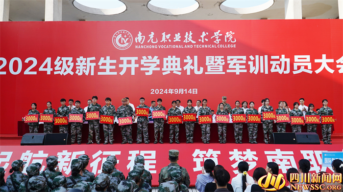 开学典礼上,南充职业技术学院党委副书记、纪委书记赖勇宣读学院表扬决定,与会领导为获奖学生颁发新生奖学金。