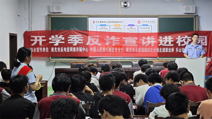 “不要轻易将自己的银行卡、身份证、电话卡等转借他人,不要随意转账!”9月26日,南充市公安局反诈中心携手南充市公安局顺庆区分局北湖派出所、乐山市商业银行南充分行,联合举办了“开学季 反诈知识进校园”电信网络诈骗防范宣传活动,为四川省南充财贸学校的秋季新生们精心策划并呈现了一场内容丰富、极具实用价值的“反诈秘籍”。