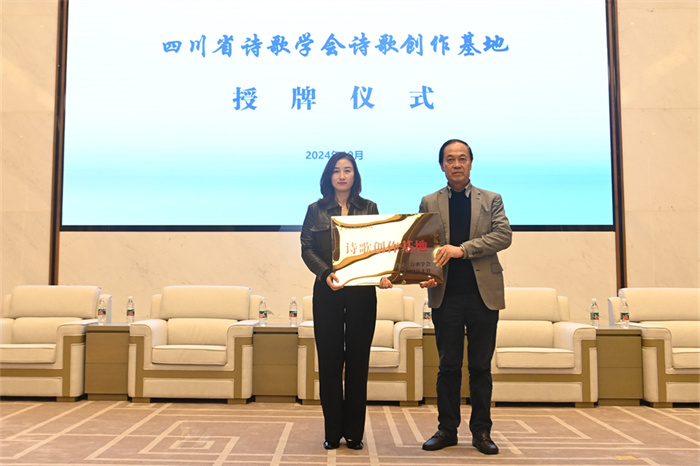 活动现场,四川省诗歌学会会长曹纪祖为相如故城授予“诗歌创作基地”牌匾,蓬安县产投集团负责人接牌。