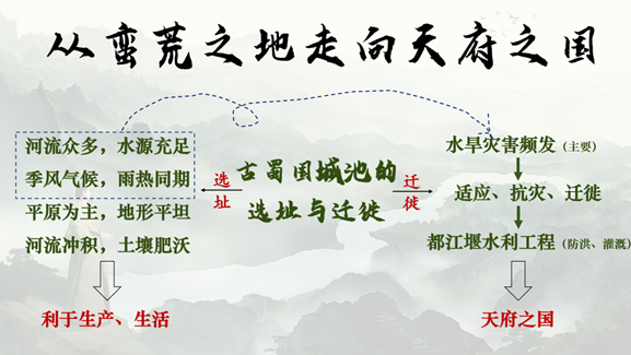 本课围绕“古蜀国城池的选址与迁徙”展开。用古蜀文明的城址分布进行课堂导入,体现了地理与历史的跨学科融合。在“第一篇:古城池选址的智慧”中教学内容涉及成都平原在水源、气候、地形、土壤等方面对人们生产生活的影响;在“第二篇:与洪水的博弈”中指向古蜀人与洪水的博弈过程,为都江堰水利工程的学习埋下伏笔,展现了成都平原从蛮荒之地走向天府之国的艰难历程。
