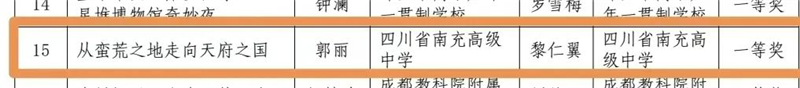 近日,四川省教育科学研究院公布2024年四川省《可爱的四川》(初中)优秀教学课例,南充高中临江校区地理组郭丽、黎仁翼老师设计的课例《从蛮荒之地走向天府之国》在134个课例中脱颖而出,荣获省一等奖。