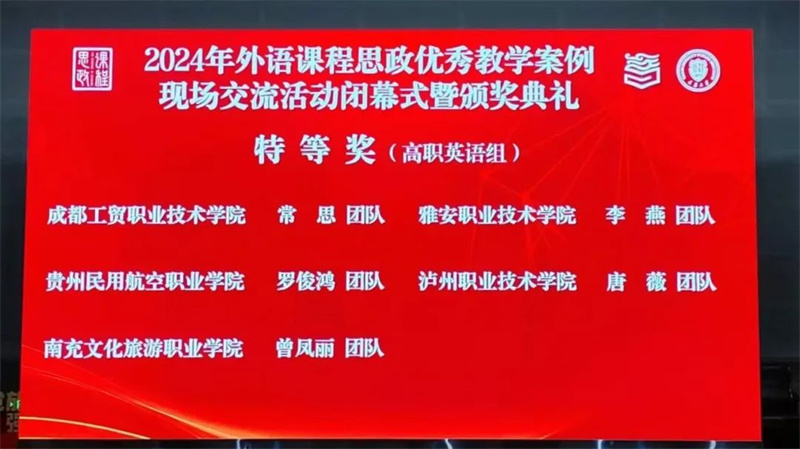 近日,南充文化旅游职业学院教师杨钰垚、韩欣桂、曾凤丽、何嘉琪、孙米莉在2024年高等学校外语课程思政优秀教学案例现场交流活动中以团队形式参赛,并凭借出色的表现斩获高职组全国特等奖。