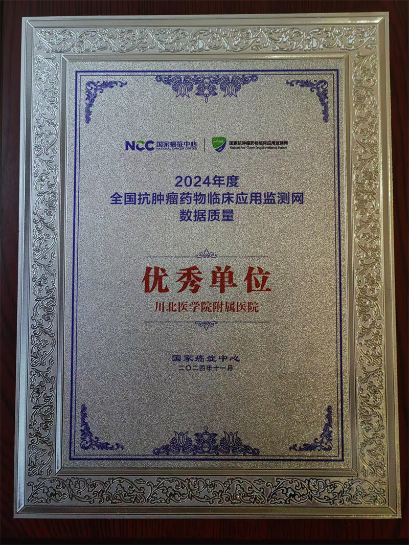近日,川北医学院附属医院在由国家癌症中心主办的“2024年国家肿瘤规范化诊疗质控高峰论坛暨第五届全国抗肿瘤药物临床应用监测网学术年会”中荣获“2024年度全国抗肿瘤药物临床应用监测网数据质量优秀单位”称号。